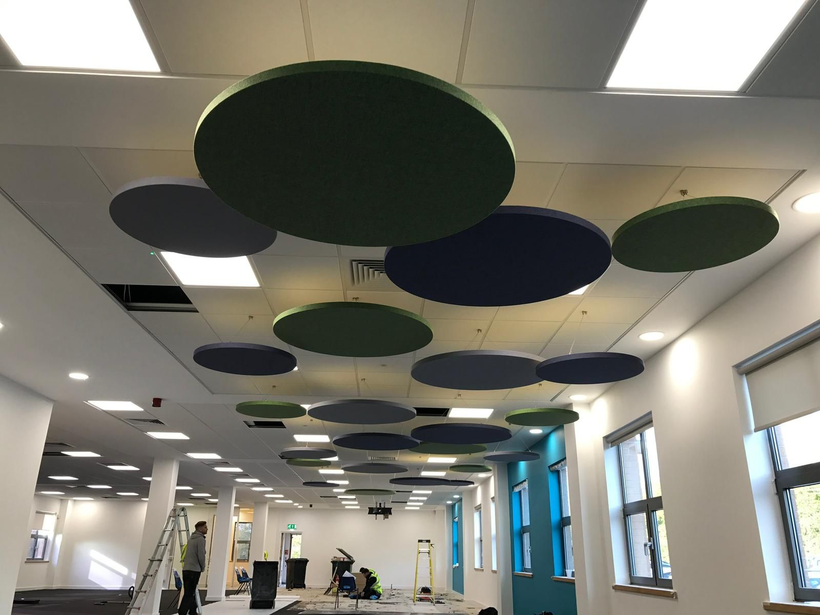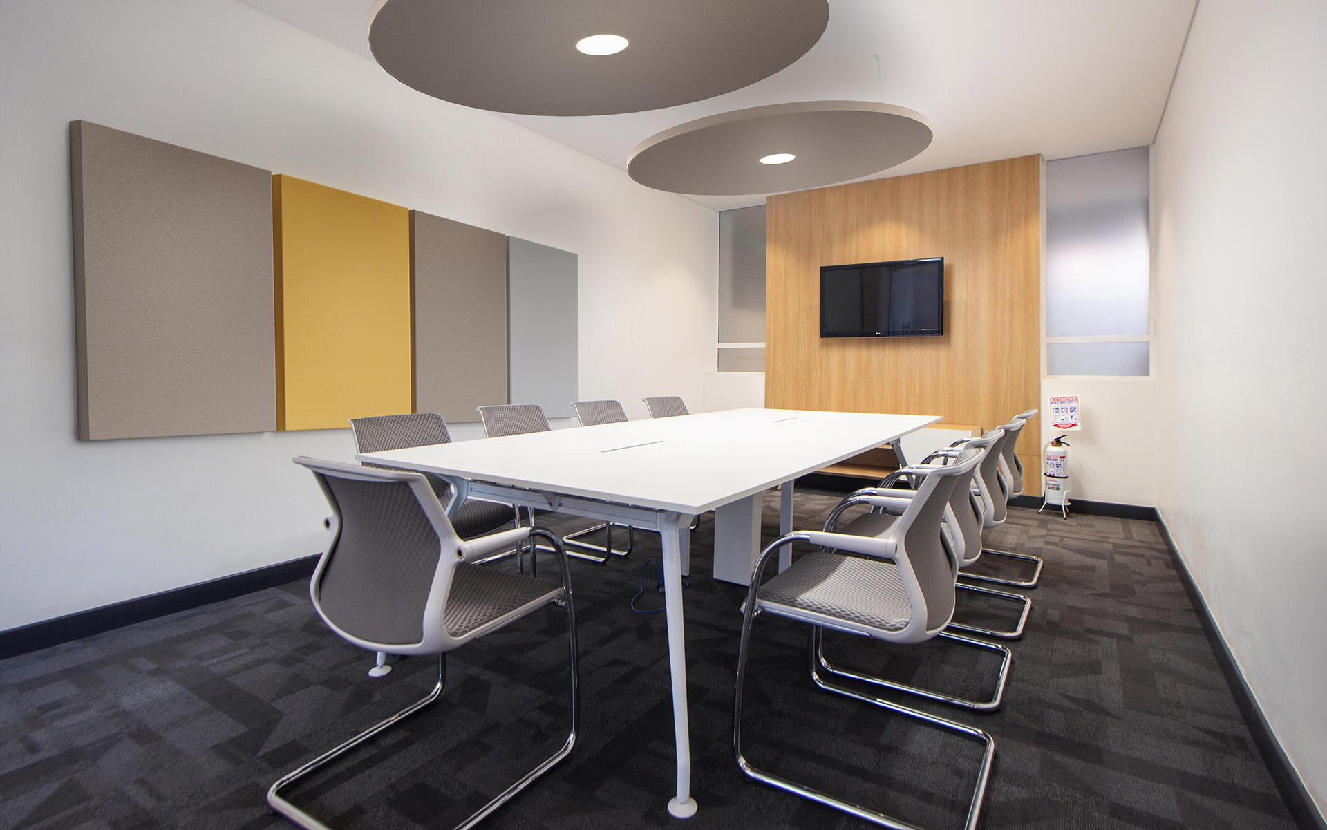 Paneles acusticos para techos, falso cielorraso, nubes acusticas suspendidas.